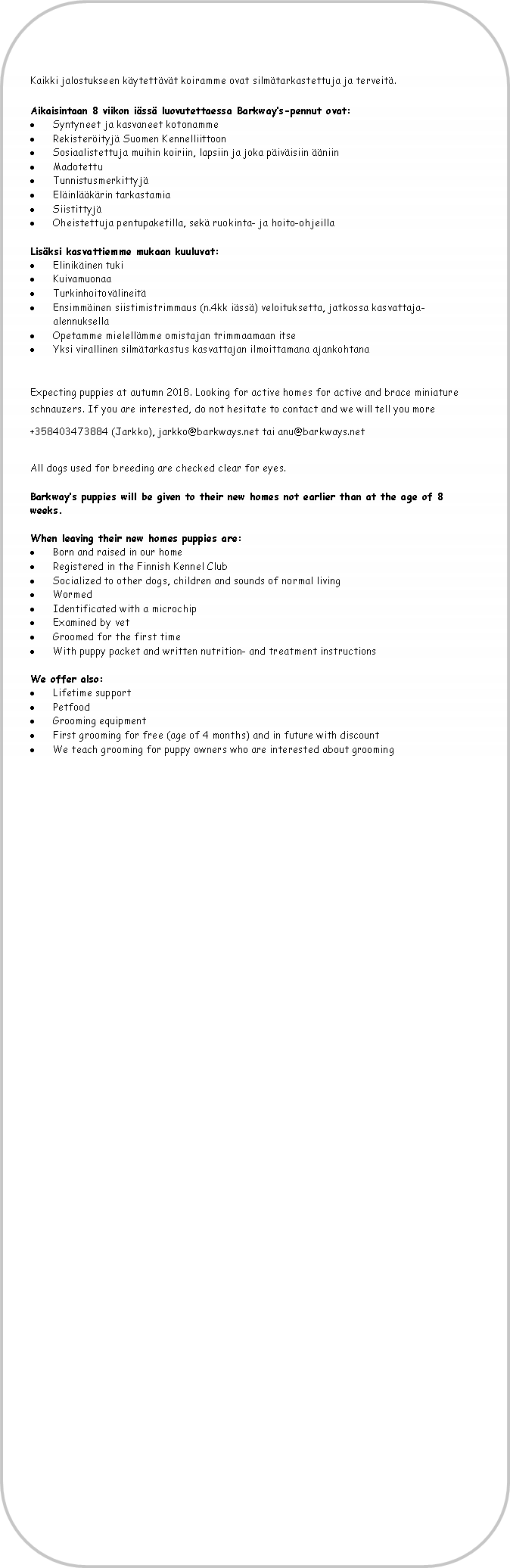 Suomen Kennelliitto Kääpiösnautserin rotumääritelmä Suomen Kääpiösnautserikerho ry Kääpiösnautsereiden jalostuksen tavoiteohjelma Kääpiösnautserin pentua hankkiessasi huomioi, että kääpiösnautserin turkinhoito vaatii tiettyä osaamista. Kääpiösnautseri on trimmattava rotu.Etenkin ensimmäistä kääpiösnautseria hankkiessa on ensiarvoisen tärkeää, että tukenasi on nimeomaan kääpiösnautserin turkin rodunomaiseen trimmaamiseen perehtynyt henkilö. |